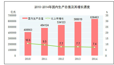初步核算,2014年国内生产总值636463亿元,比上年增长7.4%。其中,第一产业增加值58332亿元,增长4.1%;第二产业增加值271392亿元,增长7.3%;第三产业增加值306739亿元,增长8.1%。第一产业增加值占国内生产总值的比重为9.2%,第二产业增加值比重为42.6%,第三产业增加值比重为48.2%。