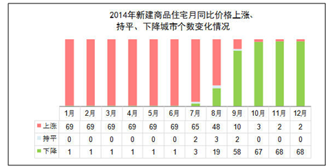 2014年新建商品住宅月度同比价格上涨、持平、下降城市个数变化情况
