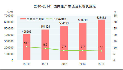 2014年国内生产总值636463亿元,比上年增长7.4%。其中,第一产业增加值58332亿元,增长4.1%;第二产业增加值271392亿元,增长7.3%;第三产业增加值306739亿元,增长8.1%。第一产业增加值占国内生产总值的比重为9.2%,第二产业增加值比重为42.6%,第三产业增加值比重为48.2%。