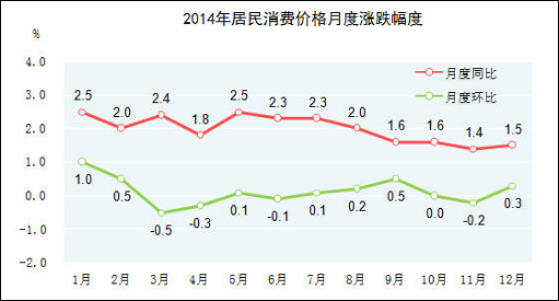价格水平涨幅较低。全年居民消费价格比上年上涨2.0%,其中食品价格上涨3.1%。固定资产投资价格上涨0.5%。工业生产者出厂价格下降1.9%。工业生产者购进价格下降2.2%。农产品生产者价格下降0.2%。