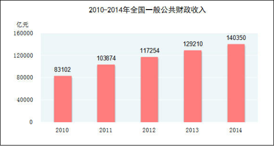 2014年全国一般公共财政收入140350亿元,比上年增加11140亿元,增长8.6%,其中税收收入119158亿元,增加8627亿元,增长7.8%。