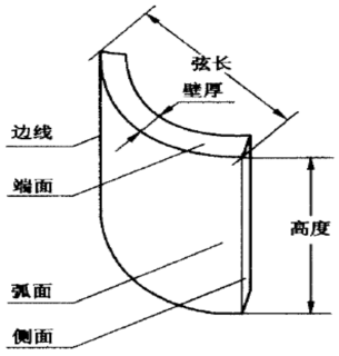 5.2.2 圆弧板壁厚最小值应不小于20 mm,规格尺寸允许偏差见表2。圆弧板各部位名称如图1所示。