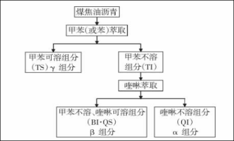 煤沥青是由多种多环芳烃化合物组成的混合物,在室温下为黑色脆性块状物,有光泽、臭味,熔融时易燃烧,有毒,属二级易燃固体,由煤干馏得到煤焦油再经蒸馏加工制成。常采用甲苯( 或苯) 和喹啉为溶剂。煤沥青分为苯可溶组分( BS) 、甲苯不溶物( TI) 、喹啉不溶物( QI) -α 树脂以及甲苯不溶喹啉可溶组分-β 树脂4 种组分。