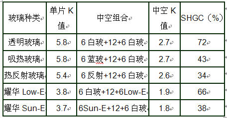 Low-E玻璃是一种对波长范围4.5~25微米的远红外线有很高反射比的镀膜玻璃。在我们周围的环境中,由于温度差引起的热量传递主要集中在远红外波段上,白玻、吸热玻璃、阳光控制镀膜玻璃对远红外热辐射的反射率很小,吸收率很高,吸收的热量将会使玻璃自身的温度提高,这样就导致热量再次向温度低的一侧传递。与之相反,Low-E玻璃可以将温度高的一侧传递过来的80%以上的远红外热辐射反射回去,从而避免了由于自身温度提高产生的二次热传递,所以Low-E玻璃具有很低的传热系数。以耀华生产的在线Low-E玻璃为例,与其它类型玻璃的对比见表2,其中耀华Low-E组合成中空时,传热系数可以达到1.9 W/m2K,比普通的白玻中空K值降低了30%。并且Low-E中空玻璃的SHGC值和可见光透过率可以按照节能的需要在生产时进行调节,严寒地区使用时可以采用可见光高透型的耀华Low-E中空玻璃,在炎热地区可以采用具有遮阳效果的耀华Sun-E中空玻璃。