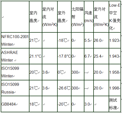中空玻璃传热系数和SHGC值的测试或模拟计算条件在各个国家的标准中略有不同。美国采用NFRC100和NFRC200,国际ISO标准为ISO15099,欧洲的prEN ISO 10077和prEN 13363标准主要采用了ISO的有关规定,我国的玻璃传热系数测试标准为GB8484,在JGJ113-2003中加入了等效于ISO10292的传热系数计算条件,按照GB/T2680可以测试或计算玻璃的光学热工性能。这些标准在测试或模拟计算的环境条件设置上,主要是在室内外温度差、对流换热系数(或风速)、太阳辐射强度等方面不完全相同。这将对最终的测试或模拟计算结果产生一定的影响,但通过采用不同标准进行模拟计算的对比表明,不同标准对SHGC值的影响甚微,对传热系数K值略有影响。以6+12+6空气填充的Low-E中空玻璃为例,依据不同标准的环境设置,使用Window5.2计算出的K值结果如表5。