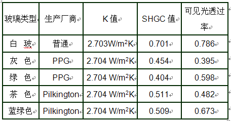 吸热玻璃是通过本体着色减小太阳光热量的透过率、增大吸收率,由于室外玻璃表面的空气流动速度会大于室内,所以能更多地带走玻璃本身的热量,从而减少了太阳辐射热进入室内的程度。不同颜色类型、不同深浅程度的吸热玻璃,都会使玻璃的SHGC值和可见光透过率发生很大的改变。但各种颜色系列的吸热玻璃,其辐射率都与普通白玻相同,约为0.84。所以在相同厚度的情况下,组成中空玻璃时传热系数K值是相同的。选取不同厂商的几种有代表性的6mm厚度吸热玻璃,中空组合方式为吸热玻璃+12mm空气+6mm白玻,表1列出了各项节能特性参数。计算结果表明,吸热玻璃仅能控制太阳辐射的热量传递,不能改变由于温度差引起的热量传递。
