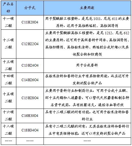 长链二元酸可以合成人造麝香、共聚酰胺塑料热熔胶、尼龙工程塑料、高级尼龙喷麽、高温电解质、高档服装热熔胶、耐寒增塑剂、高级润滑油、高级汽车油漆、防紫外线涂料、合成光缆导体等众多精细化工产品。二元酸被广泛应用于化工,轻工,国防、汽车工业、农药,医药,工程材料,晶体材料等领域。