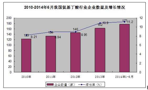 图表3 2010-2014年6月我国氨基丁酸 行业 企业数量及增长情况