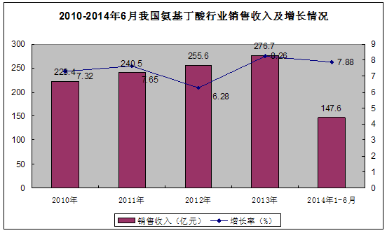图表6 2010-2014年6月我国氨基丁酸 行业 销售收入及增长情况