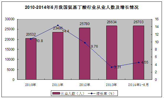 图表4 2010-2014年6月我国氨基丁酸 行业 从业人数及增长情况