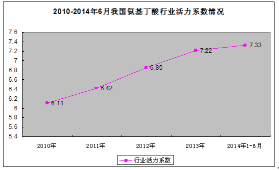 图表8 2010-2014年6月我国氨基丁酸 行业 行业 活力系数情况