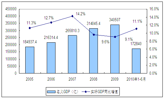 由上图可知,近年来我国国内生产总值(GDP)一直保持高速增长,增长幅度均超过了9%。虽然受世界性经济危机的影响,我国2008和2009年的GDP增长幅度有所下降,但2010年的前2个季度的经济增长幅度出现回升。