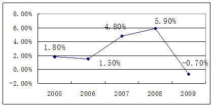 如果国内实行积极的财政政策和稳健的货币政策,将预防通货膨胀放在宏观调控的突出位置;财政赤字占GDP的比重明显小于2009年;货币政策操作逐步加大收紧力度,广义货币供应量(M2)余额同比增长率年内控制到16%左右,新增贷款规模全年控制在6万亿元左右,证券市场交投不活跃,企业直接融资规模小于2009年,全社会资金面比2009年明显收紧;在全力保证4万亿投资已开工项目进展的同时,严格控制政府投资新开工项目,房地产投资增速大体与2009年持平。由于经济刺激政策的新增量明显小于2009年,经济自主性增长动力不足,固定资产投资和社会消费品零售总额实际增速均低于2009年,企业设备利用率较低,就业困难较大,国民经济出现继续调整态势,GDP增速低于8%。由于中国经济实际增速明显低于长期潜在增长率,总量供过于求矛盾突出,几乎没有新涨价因素,CPI和PPI的上涨主要是翘尾因素影响,预计居民消费价格将上涨1.3%左右,PPI上涨3%左右。这一情景可借助世界性产业结构深度调整来淘汰国内一批落后企业和落后产能,也有利于防止通货膨胀;但就业压力增大。
