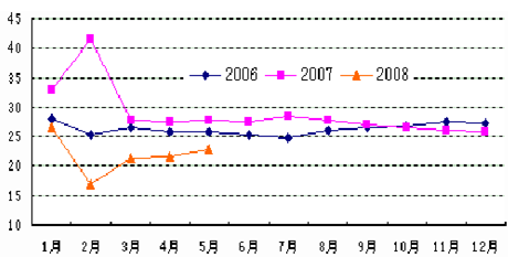 2006-2008年各月出口累计同比增速对比