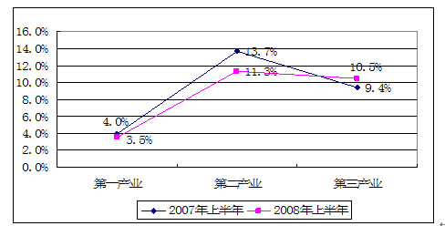 2007、2008年上半年国民产业同比增长率比较