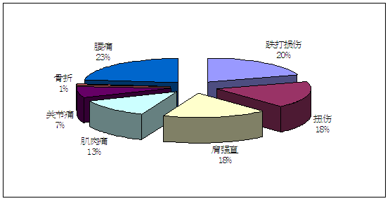 目前公众面临着三类常见疼痛:长时间久坐,不良坐姿引起的肌肉劳损或由于缺乏锻炼导致的肌肉乏力,很容易导致“颈肩腰背痛”;由于关节和肌肉的重复运动,造成肌肉和关节的损伤,出现“急性扭伤拉伤”;随着年龄的增长,中老年人容易出现“骨关节炎”,形成关节疼痛、肿胀,关节活动受限制。