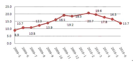3、固定资产投资增速高位回稳,房地产投资增长较快。上半年,全社会固定资产投资114187亿元,同比增长25.0%。其中,城镇固定资产投资98047亿元,增长25.5%;农村固定资产投资16140亿元,增长22.1%。在城镇固定资产投资中,第一产业投资增长17.8%,第二产业投资增长22.3%,第三产业投资增长28.4%。分地区看,东部地区投资增长22.4%,中部地区增长28.0%,西部地区增长27.3%。上半年,房地产开发投资19747亿元,增长38.1%。