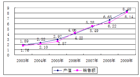 2003-2009年国内水处理用膜制品产值、销售额对比图