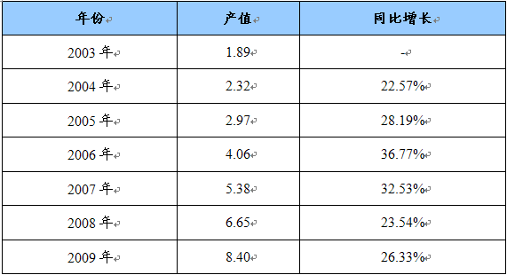 2003-2009年国内水处理用膜制品产值及同比增长统计表