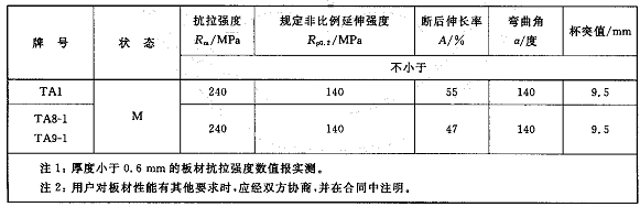 板材的室温力学性能和工艺性能应符合下表的规定。板材晶形弯曲试验时,弯曲至规定的角度后,试样弯曲处的外表面和侧面应完好。