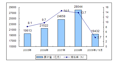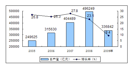 初步测算,2009年全年国内生产总值335353亿元,按可比价格计算,比上年增长8.7%,增速比上年回落0.9个百分点。
