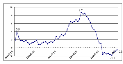 5、居民消费价格全年比上年下降0.7%。,年底出现上升。