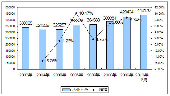 2003-2010年1-5月化学药品制剂制造 行业 从业人员发展状况