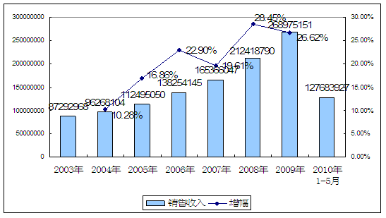 2003-2010年1-5月化学药品制剂制造 行业 销售收入发展状况
