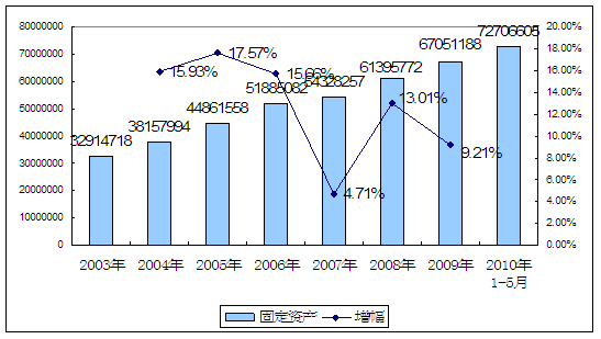 2003-2010年1-5月化学药品制剂制造 行业 固定资产发展状况
