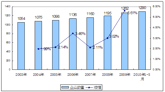 2003-2010年1-5月化学药品制剂制造 行业 企业数量发展状况