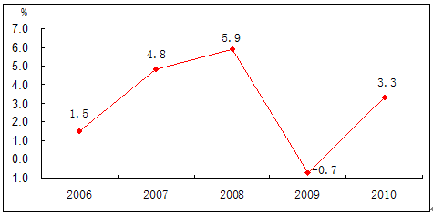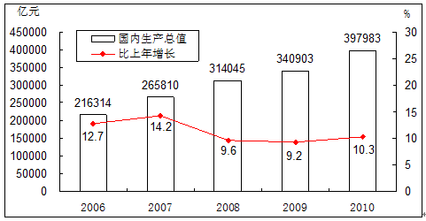 初步核算,2010全年中国国内生产总值397983亿元,比上年增长10.3%。其中,第一产业增加值40497亿元,增长4.3%;第二产业增加值186481亿元,增长12.2%;第三产业增加值171005亿元,增长9.5%。第一产业增加值占国内生产总值的比重为10.2%,第二产业增加值比重为46.8%,第三产业增加值比重为43.0%。