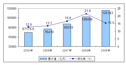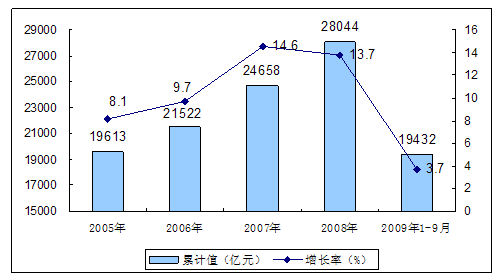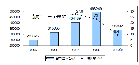 初步测算,2009年全年国内生产总值335353亿元,按可比价格计算,比上年增长8.7%,增速比上年回落0.9个百分点。