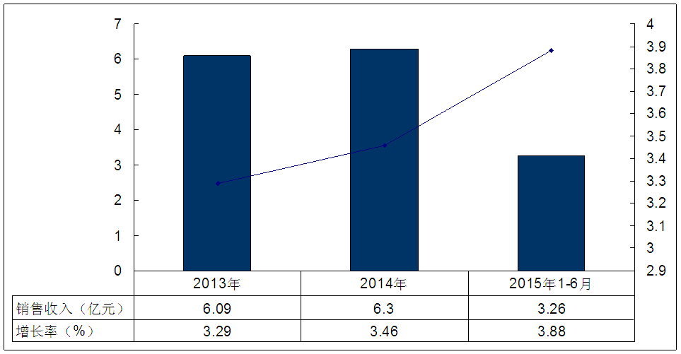 图表 6 2013-2015年6月我国旋耕刀具 行业 销售收入 分析