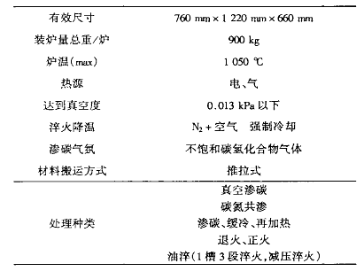 此真空渗碳炉的后部为加热室,前部设置油槽。附属装置有真空排气装置,渗碳气体导入装置,温度及气氛的控制装置等,其基本参数如下。