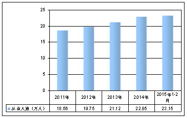图表 4 2011-2015年2月我国运动护具 行业 从业人数 分析