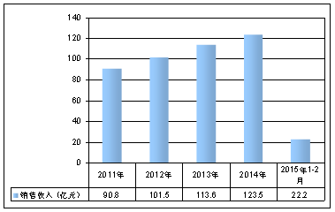 图表 6 2011-2015年2月我国运动护具 行业 销售收入 分析