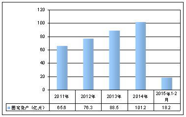 图表 5 2011-2015年2月我国运动护具 行业 固定资产 分析