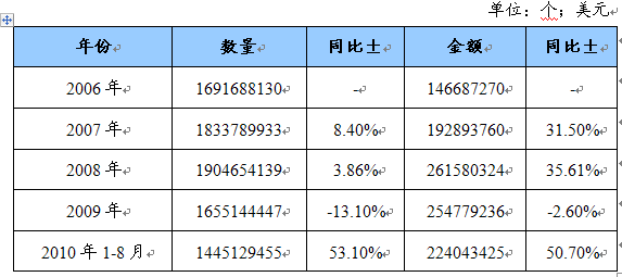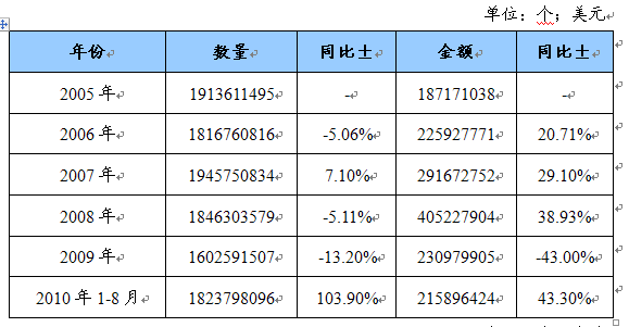 2005—2010年未装滚珠或滚子轴承的轴承座(包括滑动轴承)出口量值统计