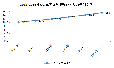 图表 8:2011-2016年Q2我国菜籽饼 行业 活力系数 分析