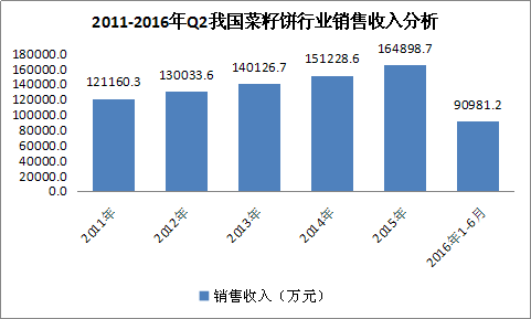 图表 6:2011-2016年Q2我国菜籽饼 行业 销售收入 分析