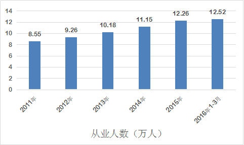 图表 3 2011-2016年3月我国滑雪板 行业 从业人数 分析