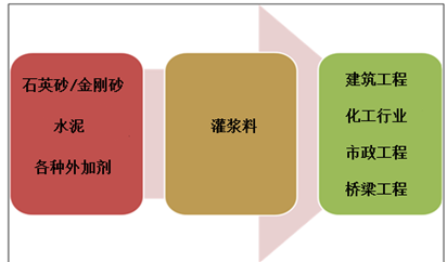灌浆料上游主要是以高强度材料作为骨料(如:石英砂等),以水泥为结合剂,辅以高流态、微膨胀、防离析等外加剂(如:减水剂)配制而成。下游主要应用于建筑工程、化工