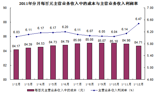 图表 18 2011年分月每百元主营业务收入中的成本与主营业务收入利润率