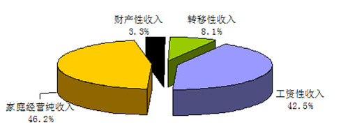 2012年前三季度,城镇居民人均总收入20190元。其中,城镇居民人均可支配收入18427元,同比名义增长13.0%;扣除价格因素实际增长9.8%,增速比上年同期加快2.0个百分点。在城镇居民人均总收入中,工资性收入同比名义增长12.7%,转移性收入增长12.4%,经营净收入增长15.4%,财产性收入增长12.4%。