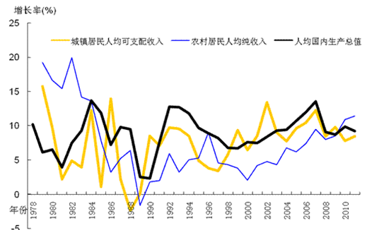 2011年大多数农村居民收入增速较快,但棉花、土豆等部分农产品价格急跌也造成部分农户减收,甚至亏损,拉低了农村居民人均纯收入的增长速度。