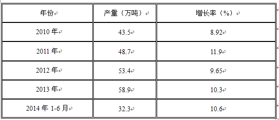 图表122010-2014年6月我国亚麻 行业 产量及增长情况