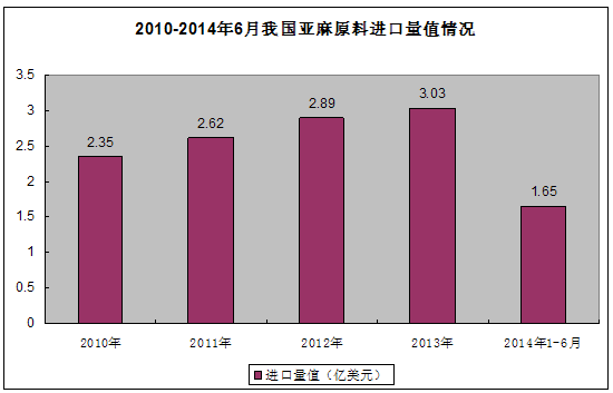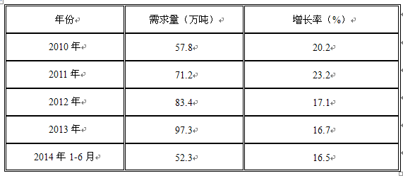 图表142010-2014年6月我国亚麻 行业 需求及增长情况