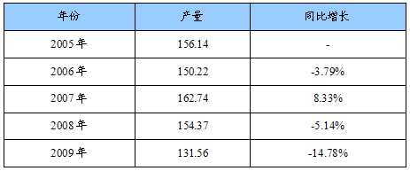由上表可知:2008年国际性金融危机爆发以前,我国石蜡的产量呈递增趋势。受金融危机影响,2008年我国石蜡产量减少5.14%。2009年由于国际性的经济危机还没有过去,加上各生产企业生产 规划 的调整,搬迁,以及设备检修等原因。致使2009年我国石蜡产量出现大幅下滑。