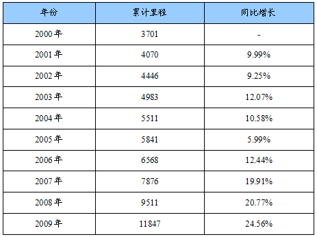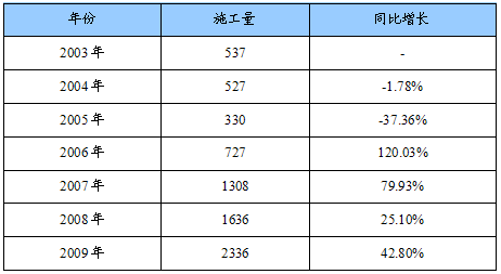 “十一五”期间,我国铁路隧道预计新建达3000公里以上。特别是近几年我国加快了高速铁路的建设,使得铁路隧道需求量快速增长。根据武广高铁建设情况,全线桥隧总长579.549km,占线路长度的59.9%。共有桥梁661座401.239km,占线路长度的41.4%,隧道涵洞数量设计建设数量较多。