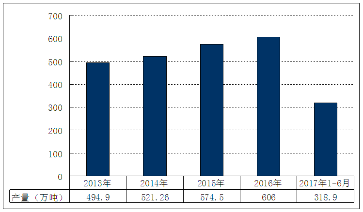 图表 12 2013-2017年6月玻璃纤维纱 行业 产量统计